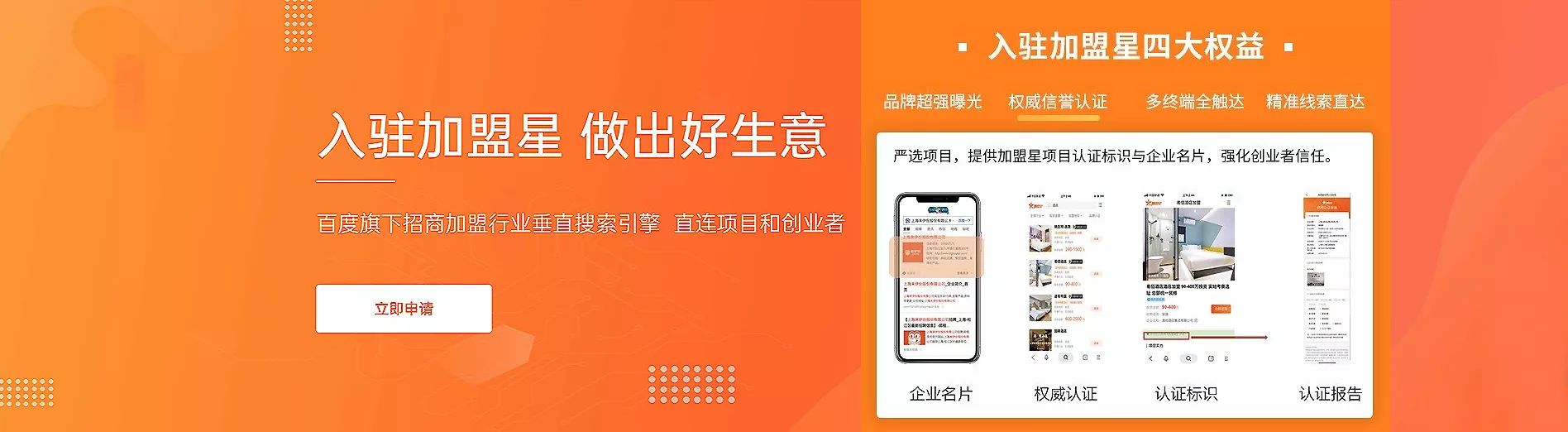 加盟星是百度倾力打造的一站式招商加盟项目咨询和服务平台,依托于百度构建的一套项目权威真实认证体系,汇集加盟商丰富的项目信息,帮助创业者更高效地找到理想中的投资项目,降低品牌获取线索成本,提升获客转化率。
